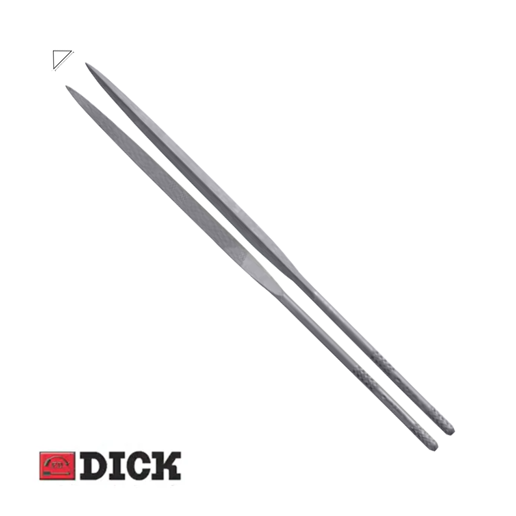 DICK Needle files are recommended for steel, steel alloys, soft metals and finishing work. These thin and pointed files have a round handle, sharp edges and points. Length = Total length